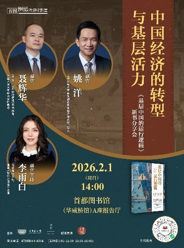 内容:在百年变局与高质量发展的背景下,中国经济发展既迎来创新突破与产业升级,也面对结构调整与国际竞争等挑战。为深入探讨中国经济的内在逻辑与转型动力,2月1日周日,特邀姚洋、聂辉华教授,围绕《基层中国的运行逻辑》一书展开对谈。活动将从基层视角出发,解析中国经济的韧性与潜能,助力读者在变局中构建认知框架,把握个人与时代发展机遇。期待与你共同读懂中国经济。