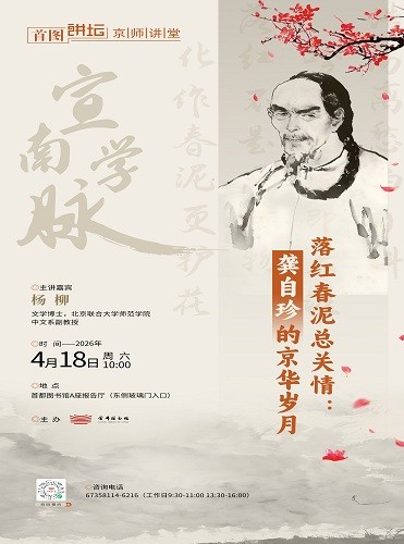 内容:“落红不是无情物”家喻户晓,但很少有人知道,写下这句诗的龚自珍,其实是个“老北京”。城南的槐荫花事伴他成长,西山的古松翠微激荡他的胸怀,万柳堂的荒废触发他对时代的深沉追问,居庸关的雄风淬炼出他的豪侠之气。他在这里寻梦、碰壁、沉思、呐喊,也在这里完成了从传统文人到近代思想先驱的蜕变。本讲座将从全新的角度,呈现一个与北京血脉交融的龚自珍。